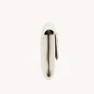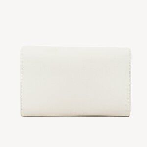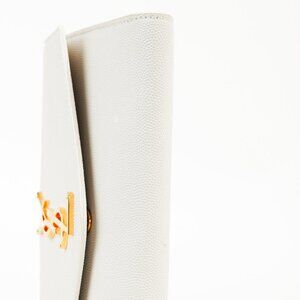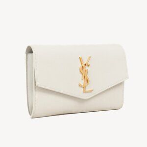 The Uptown shoulder bag from Saint Laurent is crafted in an off-white textured leather, and features gold-tone metal hardware, a detachable chain shoulder strap, a "YSL" logo plaque, a front flap secured with a snap closure, and a black leather-lined interior containing a single flat pocket.