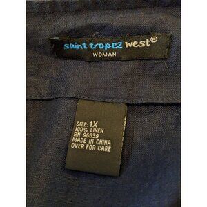 Saint Tropez West Womens Top 100% Linen Size 1X Navy Embroidered Elbow Sleeve