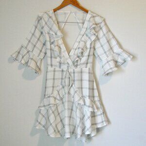 Saints + Secrets Mini Dress White Black Check Ruffle Trim Keyhole Back Small NWT