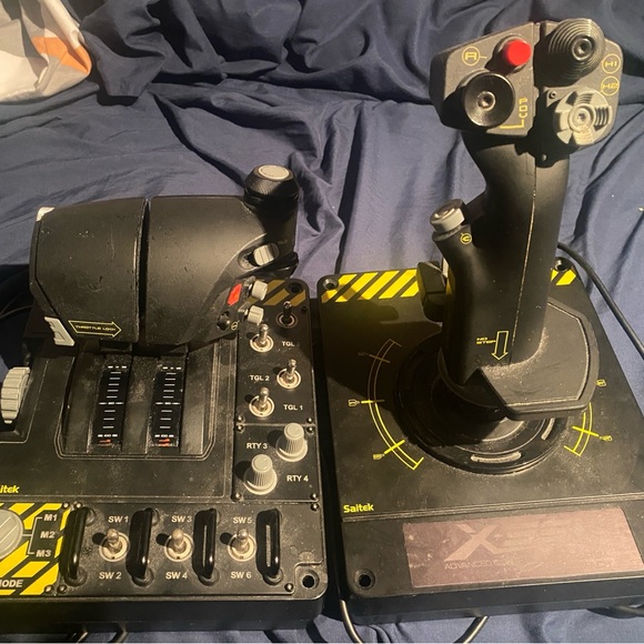 Saitek X52 flight control system with joystick and throttle. Black with yellow accents.