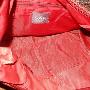 really nice coral crochet Sak purse, Brown leather handles. unused condition.