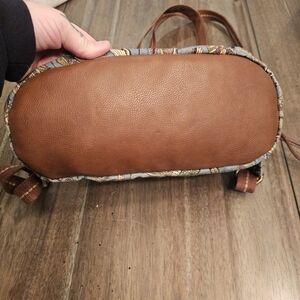 sakroots multi colored bag. has straps to be a backpack or a strap on top to use as a purse. has a few small marks on the inside. outside is very clean, no cracking or peeling