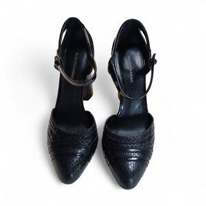 Step up your style with these chic Saks Fifth Avenue D’Orsay heels in glossy black patent leather. Featuring an embossed reptile pattern on the front toe for a subtle luxe detail and a snap closure ankle strap for secure, comfortable wear. With a classic 4-inch heel, these shoes elevate any outfit—from office looks to evening elegance.