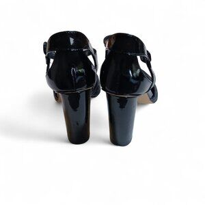 Size: 7.5M Style: D’Orsay Heel height: 4” Closure: Snap ankle strap Color: Black patent leather Authenticity code: CA 00234