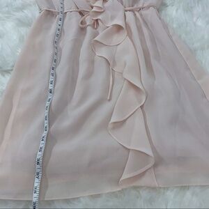 This beautiful dress by Saks Fifth Avenue in a delicate pink colour is the perfect formal dress for spring and summer. It is lined, has an elastic waistband as well as a tie, and flowy ruffle accents.