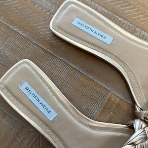 Elegant gold woven sandals. Square toe design. Perfect for any occasion.