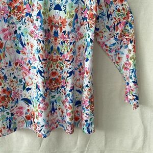Orange blue all over floral, polyester spandex, long sleeve, v neck, EUC, neck to hem 28”, armpit to armpit 20”, armpit to cuff 18”.