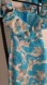 Elegant dress with ruffled neckline. Features a blue and cream floral pattern.