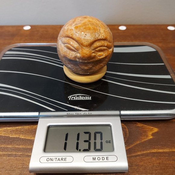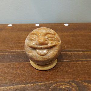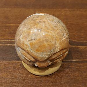 Beautiful Peach Moon Store Smiling Buddha Sphere, is beautiful, has a few minor natural imperfections/fault lines which opened during the polishing process but is still gorgeous. Sphere is carved into an adorable smiling buddha which can be rotated down, unseen if preferred.