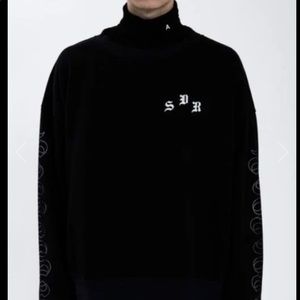 Black regular fit crewneck sweater. Features a white logo text graphic on the left chest. Interlocked 'S' outline graphics along either sleeve in white. Finished with a rib knit crewneck collar, cuffs and hem.