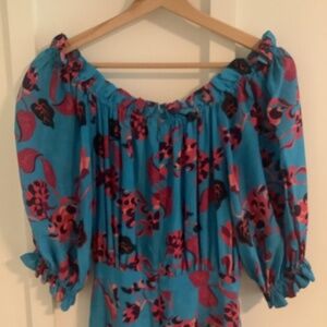 Saloni Olivia Silk dress in blue and pink floral, size 0. Beautiful fabric and flattering style. Minor marking on back.