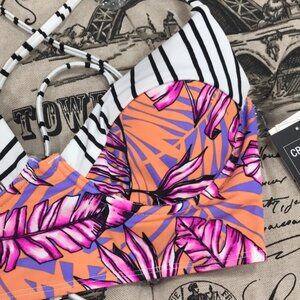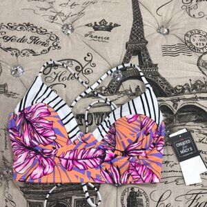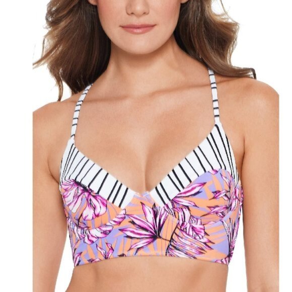 Lush island-inspired foliage accents sleek stripes, bringing a fresh look to this longer-line bikini top from Salt + Cove.