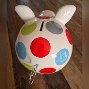 Charming ceramic piggy bank with vibrant polka dots. Features red, blue, green, and gray spots on a white base. Perfect for saving coins in style.
