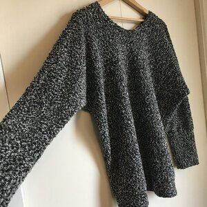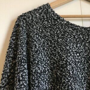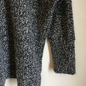 Very good preowned condition, black and white, salt and peppered sweater. Simple and cute. Because of the weight and way this sweater is knit, the neck rests across the collar almost like a boat neck.