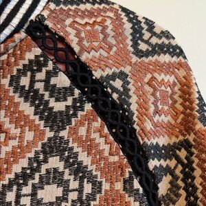 This Saltwater Luxe jacket is a mid-length, zip-up bomber jacket in a geometric Aztec pattern featuring colors of brown, black, and white.
