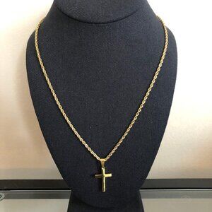 This cross was recently launched and has been a favorite ever since! The chain is an 18K gold-plated rope chain with a small gold-plated cross on it. Super unisex! The chain length is 21.5 inches.