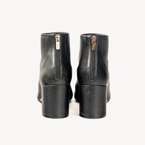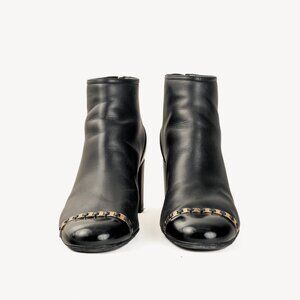 Expertly crafted with a rounded black leather toe and adorned with a signature logo chain trim, the Salvatore Ferragamo Atri Glossy Cap Toe Black Leather Ankle Boot exudes superior style. Its 2.5" block heel offers comfortable height, while the back zipper allows for easy on and off. Elevate any outfit with this sleek and timeless boot.