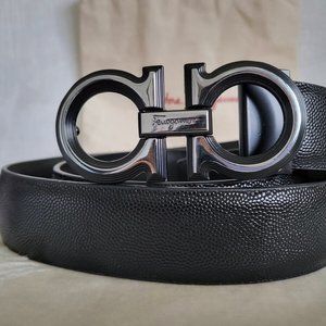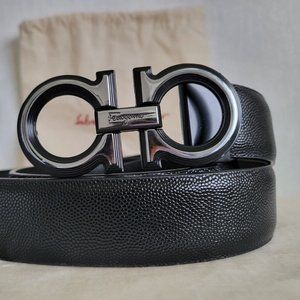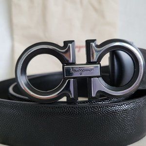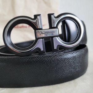 Enhance your style with this men's reversible belt from designer Ferragamo. The color combination of black and russet adds a classic touch, while solid patterns and buttons give it a modern edge. The belt is made of high-quality stainless steel and leather materials to ensure durability. It is suitable for any occasion, from a formal event to a casual day, and is suitable for most men. It features a sleek and stylish Ganchini logo that adds to its designer appeal. This belt is a great addition to any wardrobe and is sure to impress.