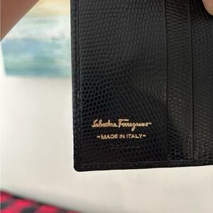 Elegant black textured wallet by Salvatore Ferragamo with gold lettering. A sophisticated accessory for any occasion. In good condition