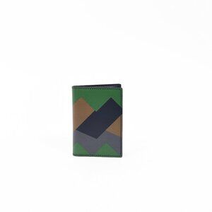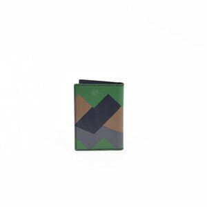 This Salvatore Ferragamo bi-fold card holder features a bold geometric colorblock pattern in green, brown, and black tones. Crafted in smooth calf leather, the wallet includes one interior card slot and an ID window, offering compact yet functional storage. This piece is in brand new condition and comes with its original box.