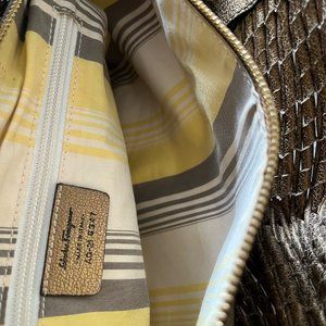 Salvatore Ferragamo shoulder bag in gold featuring: Metallic leather animal print with gold-tone hardware, dual shoulder straps, nylon lining & single interior pocket, zip closure at top, protective feet at base