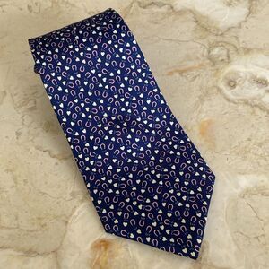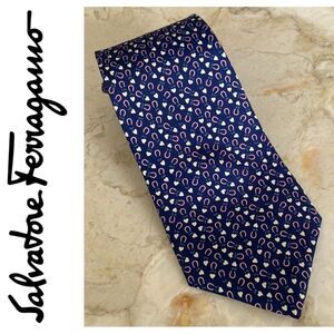 In excellent preowned condition elegant Salvatore Ferragamo 100% silk tie. On a beautiful blue background this tie has a whimsical all over print featuring pink magnets and white hearts.