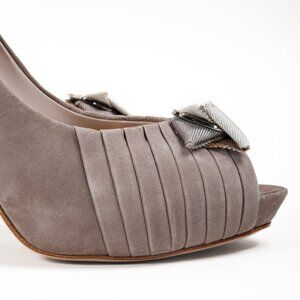 These enchanting platform heels, crafted from svelte suede by Salvatore Ferragamo in a classic mauve. Featuring a charming peep-toe silhouette with enchanting bows on the front, engraved with the Ferragamo logo on gold-tone hardware, and resting on 115-mm heels, these pumps are a must have!