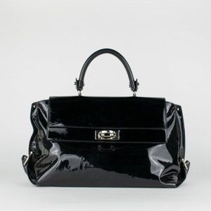This easy chic Salvatore Ferragamo in black patent leather hits the perfect balance with its unstructured slouch and sleek gloss. Features silver tone Gancio turn-lock closure and corner rings, back exterior zip pocket with patent leather looped pull-tab, top handle and removable adjustable shoulder strap. The spacious interior features a zipped closure, jacquard logo lining, two open pockets of different size at the front, and a large zipped pocket at the back. Silver tone feet at bottom.