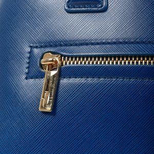 The Salvatore Ferragamo Mini Darina bag crafted from Saffiano leather in sapphire blue, featuring a structured dome silhouette, gold-tone hardware, rolled leather handles, a zip-around top closure, protective base studs, an exterior zip pocket at the back, and the signature Gancini plaque at the front. Its spacious interior is lined with jacquard nylon canvas in black and equipped with two slip compartments and a zipper pocket. The mini Darina bag comes with an optional leather strap in matching blue for you to carry it on the shoulder or crossbody.