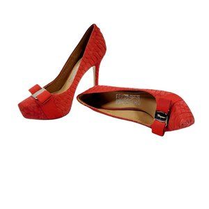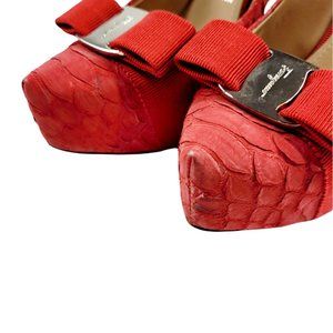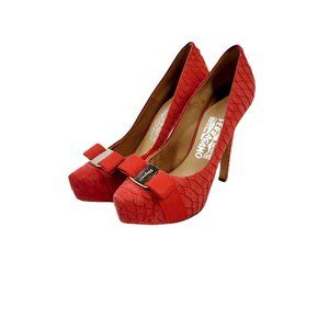 Salvatore Ferragamo Suede Trilly Python Platform Stiletto designed with Vara Bow details. Silver tone hardware with leather insole and outsole. Made in Italy. In excellent condition with light scuff on exterior. Original dust bag included.