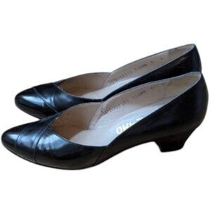 Salvatore Ferragamo women's shoes, featuring a black leather upper with a patent leather cap-toe and a classic pump design. The shoes have a low heel, and a slip-on design. The interior lining is likely leather, and the brand name "FERRAGAMO" is visible inside the shoe. These shoes are a classic design that can be worn for various occasions, from office wear to formal events.