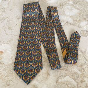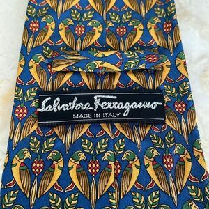 In excellent preowned condition gorgeous authentic Salvatore Ferragamo 100% silk tie featuring an all over print of lovebirds . Elegant tones, 3.75” wide.