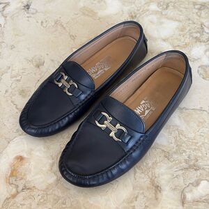 Authentic Salvatore Ferragamo leather driving shoes with classic Gancini ornament. These vintage shoes are in very good condition leather uppers and in great shape with no marks or scuffing, soles are also good but please note there was a wear area at the tip of the sole of the right shoe. (See last photo). The repair was done by a cobbler.