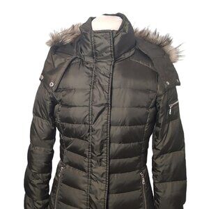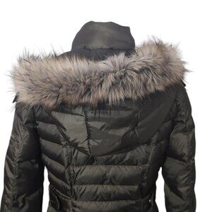 This is an olive green mid-length puffer coat with a fur trim collar by Sam Edelman.