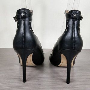 A slim ankle strap provides a smart balance to the wavy, studded topline of this playful take on a classic pointy-toe pump.