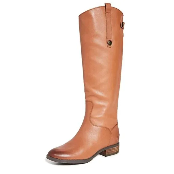 A rich, burnished finish enhances a knee-high leather boot with a svelte slanted shaft.