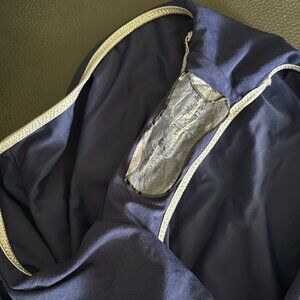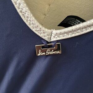 Navy blue fully lined suit by Sam Edelman. Plunge neckline with metallic silver trim along leg openings, neckline and straps. Straps are adjustable. Includes removable soft cups.