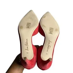 Chic red heels with ankle strap. Sleek pointed toe design. Perfect for any occasion.