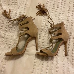 Sam Edelman beige suede stilettos with tie up laces. So gorgeous, but unfortunately I don’t have a need for stilettos these days! They zip at the back which makes them easier to put on / sturdier.