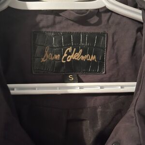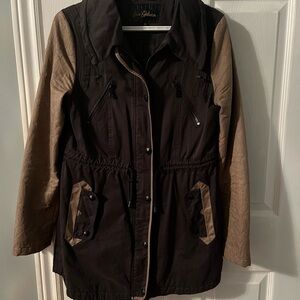 Stylish jacket with contrasting sleeves. Features multiple pockets and adjustable waist.