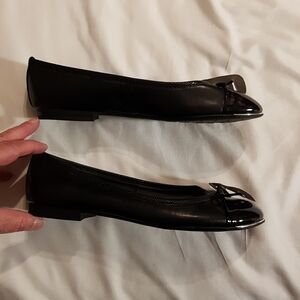 NWOT have bow cardboard attached from original purchase. Sam Edelman black Circus flats size 71/2 womens, with silver accent on the front toe area, small circle medallion with black bow on both toe areas.