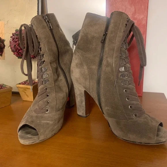 Lush, soft, taupe, open-toed suede booty by Sam Edelman. Great Preloved condition. Zipper up the side and laces for style. Buckle at the ankle. 3 inch heel. Suede is in good condition with a few minor marks as shown. TTS.