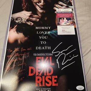 Sam Raimi and Alyssa Sutherland SIGNED 'EVIL DEAD RISE 11x17 INSCRIPTION AND JSA