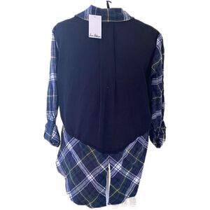 Plaid cotton shirt with chiffon detail, Johnny collar, long roll-tab shoulders, barrel button cuffs