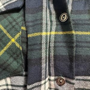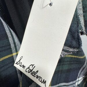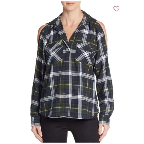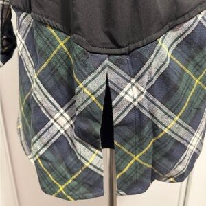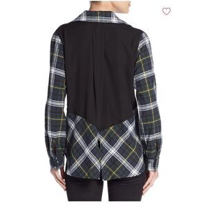 Plaid cotton shirt with chiffon detail, Johnny collar, long roll-tab shoulders, barrel button cuffs