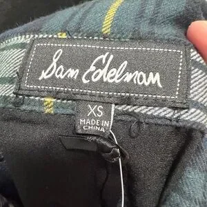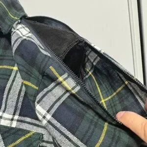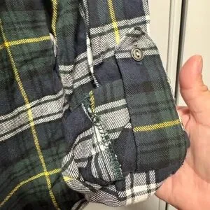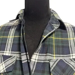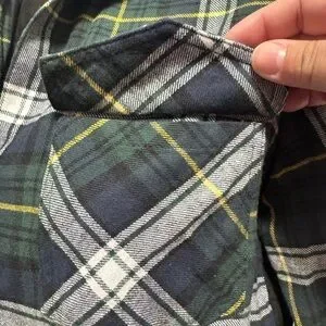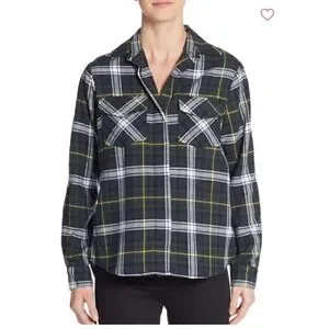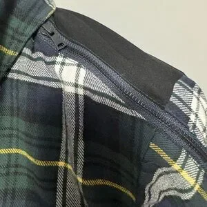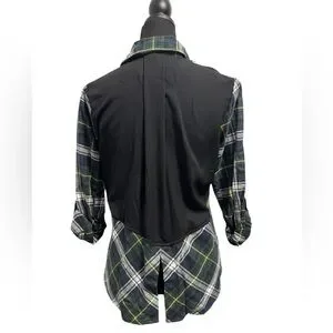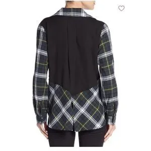 Plaid cotton shirt with chiffon detail, Johnny collar, long roll-tab shoulders, barrel button cuffs
