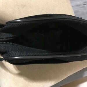Black travel case with two openings, zipper closures. The bag is 10" wide, 8" height. There is a carry handle on the side. Vintage item. Canvas type material.