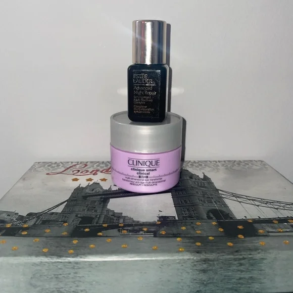 Clinique Smart night cream in light purple jar. Estée Lauder Advanced Night Repair serum in dark blue bottle.
