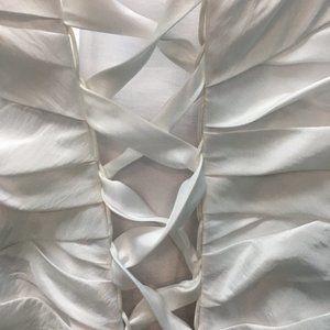 Please keep in mind ALL designer bridal gowns require altering for fit, all new designer gowns do. This dress is taffeta and has a slight sweetheart neckline that comes down to meet a beautifully pleated/ruched fabric fitted sheath that ends at the knee. This dress can easily be accessorized with a variety of belts and sashes, and even little capped straps or sleeves. This dress is a shop sample and has been tried on. It is in excellent sample condition, save the threading at the seam at the bum is undone; will need re-stitching.