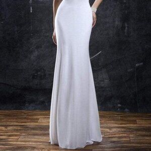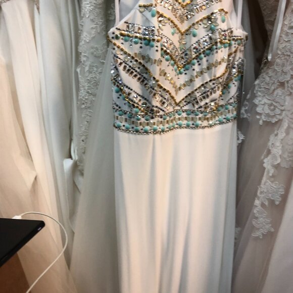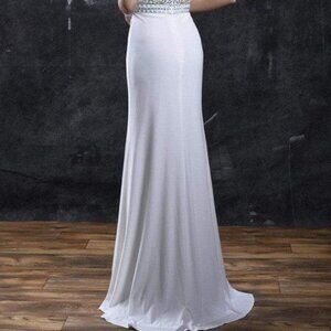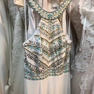 Beautiful unique white/multi fitted slinky beachy wedding gown! This dress is a beautiful lovely bridal jersey, with gorgeous beading detail trimming all along the bodice of this gown. This dress is very simple and elegant. I would definitely add a maybe a leg slit!!) to this gown if I were wearing it!!